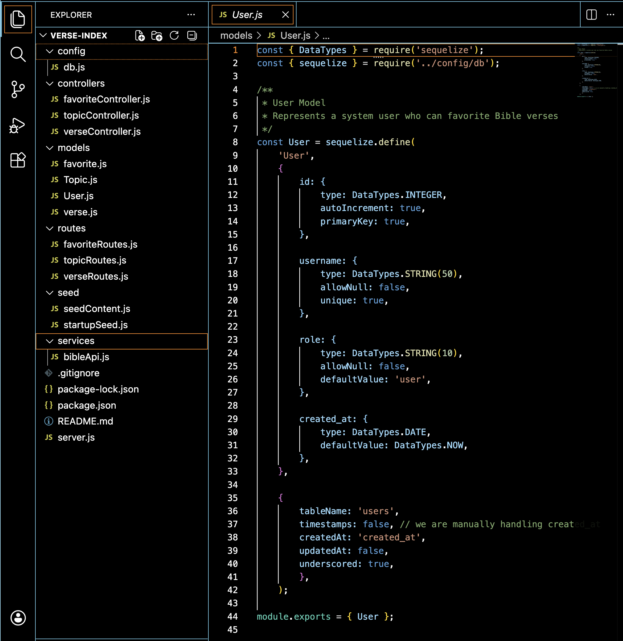 The database includes four main entities. These are Users, Topics, Verses, and Favorites.